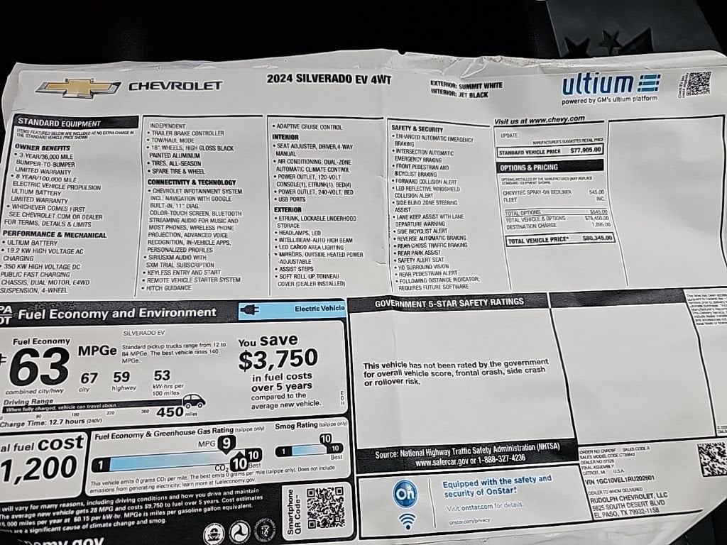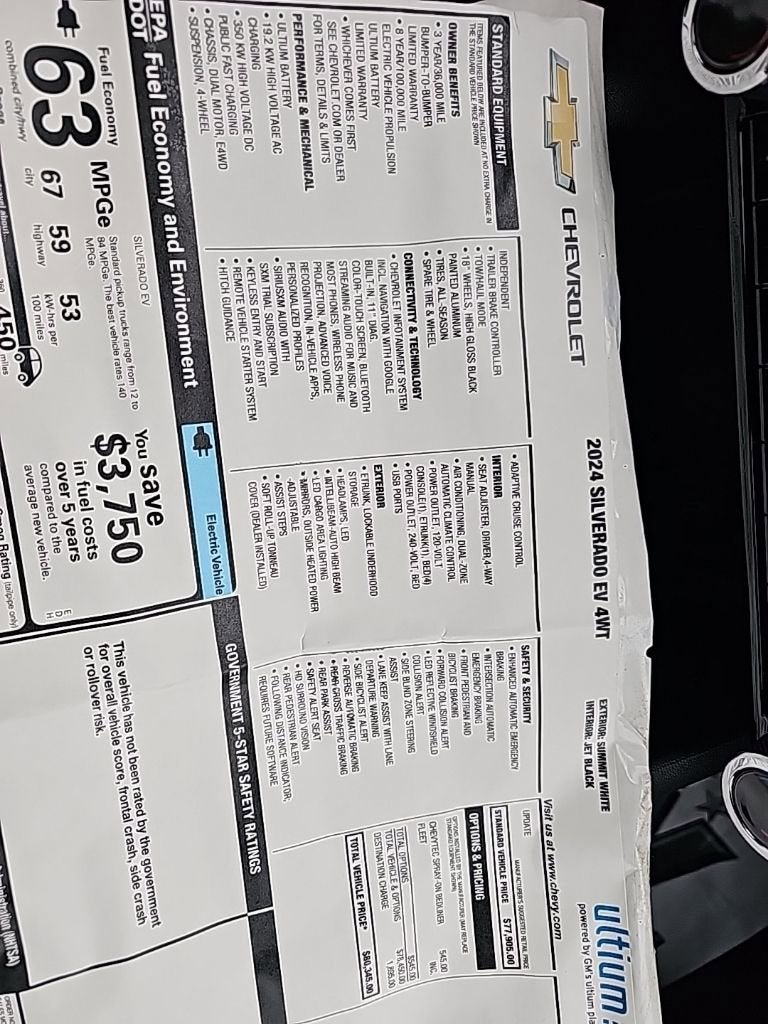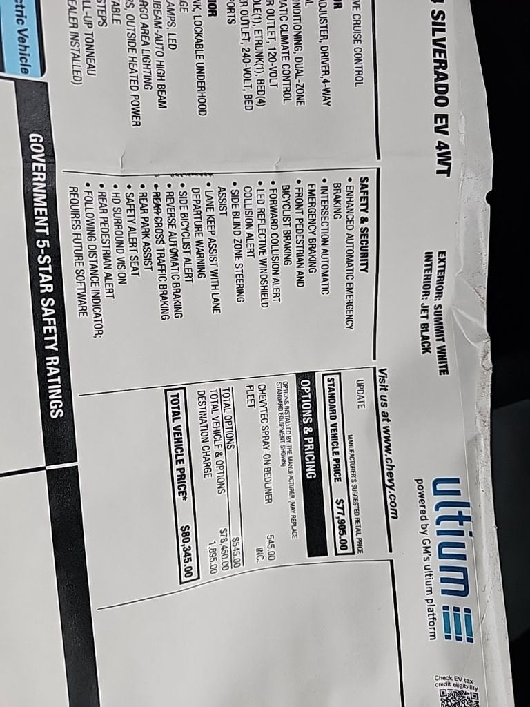 Summit White Work Truck Electric ZEV AWD Bluetooth®, 4-Way Manual Driver Seat Adjuster, 4-Way Manual Front Passenger Seat Adjuster, 4-Wheel Disc Brakes, 4-Wheel Independent Premium Ride Suspension, 6-Speaker Audio System Feature, ABS brakes, Air Conditioning, AM/FM radio: SiriusXM, Apple CarPlay/Android Auto, Auto High-beam Headlights, Automatic temperature control, Axle Ratio: TBD, Black Chevytec Spray-On Bedliner, Brake assist, Delay-off headlights, Dual front impact airbags, Dual front side impact airbags, Electronic Stability Control, Evotex Seat Trim, Exterior Parking Camera Rear, Four wheel independent suspension, Front anti-roll bar, Front Bucket Seats, Front Center Armrest w/Storage, Front dual zone A/C, Front License Plate Bracket Mounting Package, Front reading lights, Fully automatic headlights, Heated door mirrors, Low tire pressure warning, Navigation System, Occupant sensing airbag, Outside temperature display, Overhead airbag, Overhead console, Panic alarm, Passenger vanity mirror, Power door mirrors, Power steering, Power windows, Preferred Equipment Group 4WT, Radio data system, Radio: 11.3 Diagonal Advanced Color LCD Display, Rear reading lights, Rear step bumper, Remote keyless entry, SiriusXM Radio, Speed control, Speed-sensing steering, Split folding rear seat, Steering wheel mounted audio controls, Telescoping steering wheel, Tilt steering wheel, Traction control, Trip computer, Variably intermittent wipers, Wheels: 18 x 8.5 High Gloss Black Painted Alum, Wireless Phone Projection. Odometer is 11413 miles below market average! 72/62 City/Highway MPG